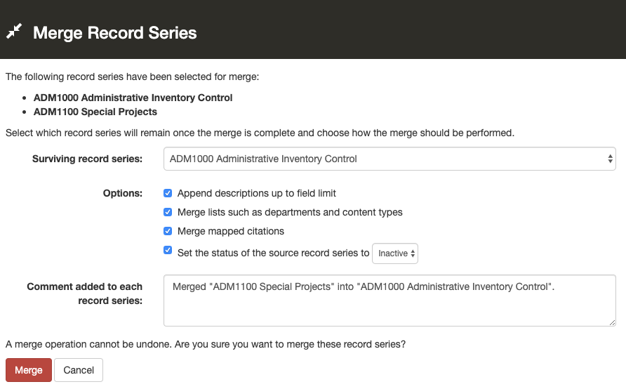 To view an example of the Merge Record Series page, hover your mouse over the image.
