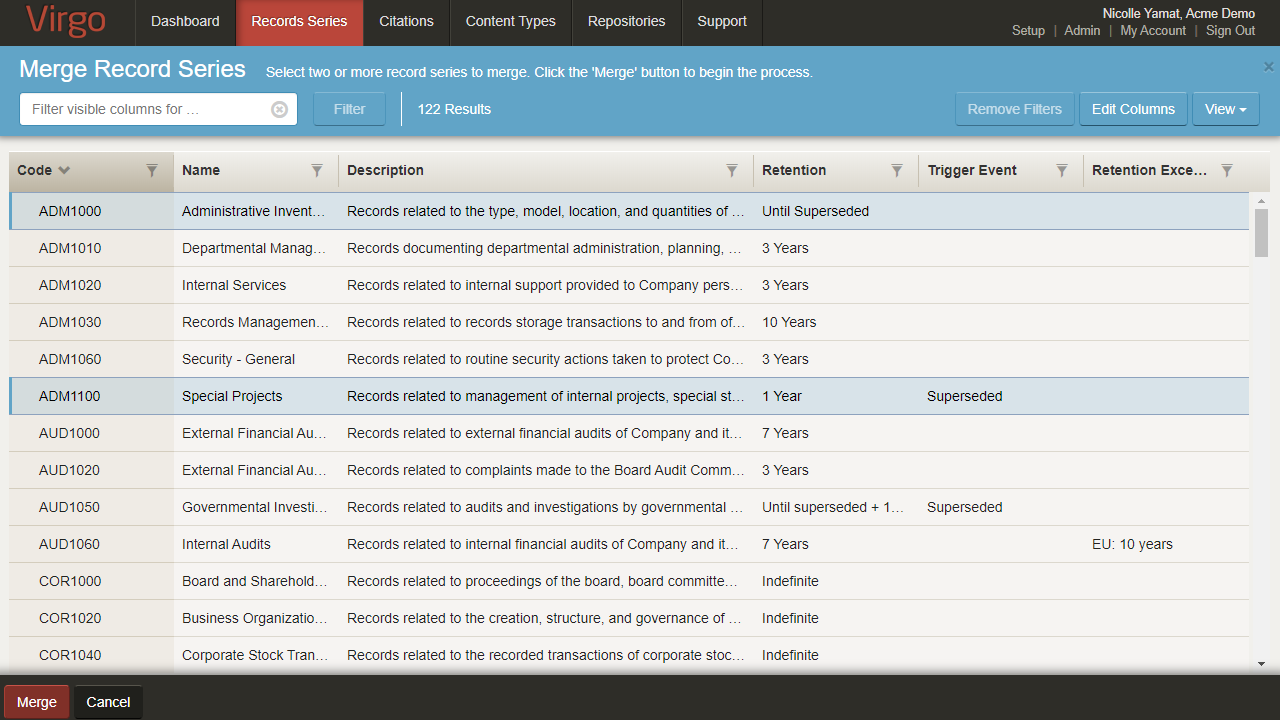 Access Unify | Lifecycle’s merge feature allows you to consolidate two or more record series and it takes care of all the details: