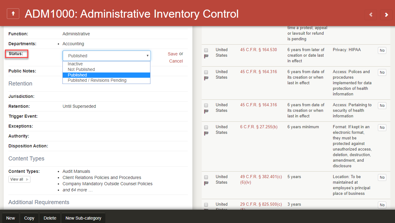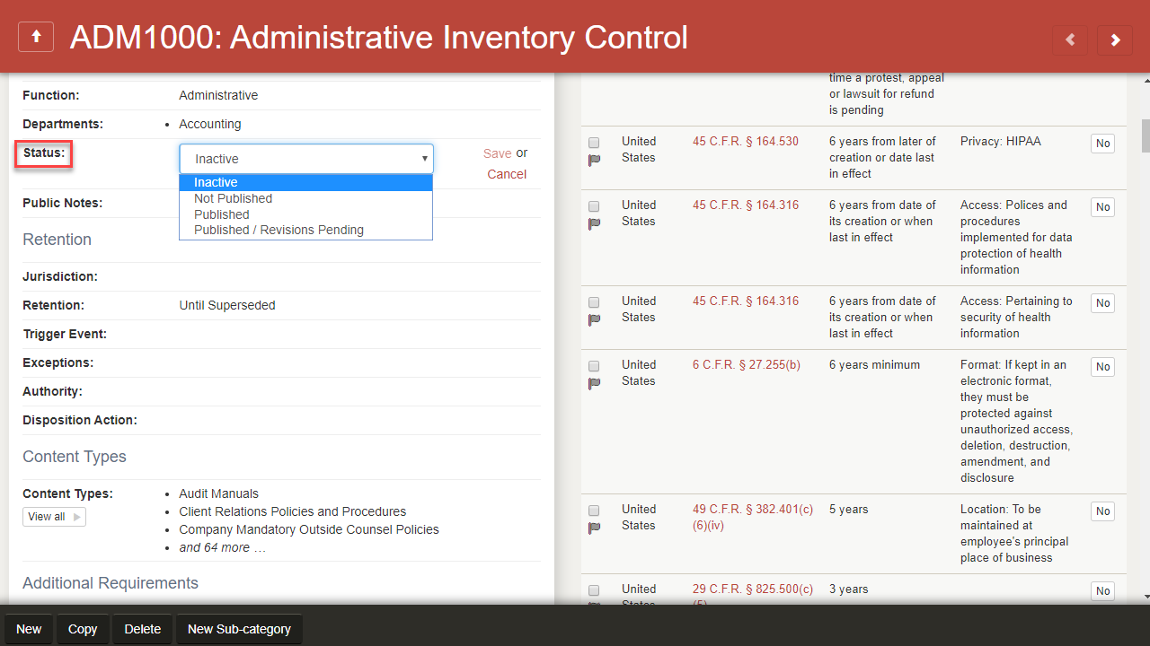 In the Setup feature, Administrators and others with permissions determine the values you can select for the record series fields. For example, the values of the Status field are determined by the Record Series Status tab in Setup. Record Series Status also determines when a record series is eligible to be published to the Access Unify | Lifecycle Employee Portal.