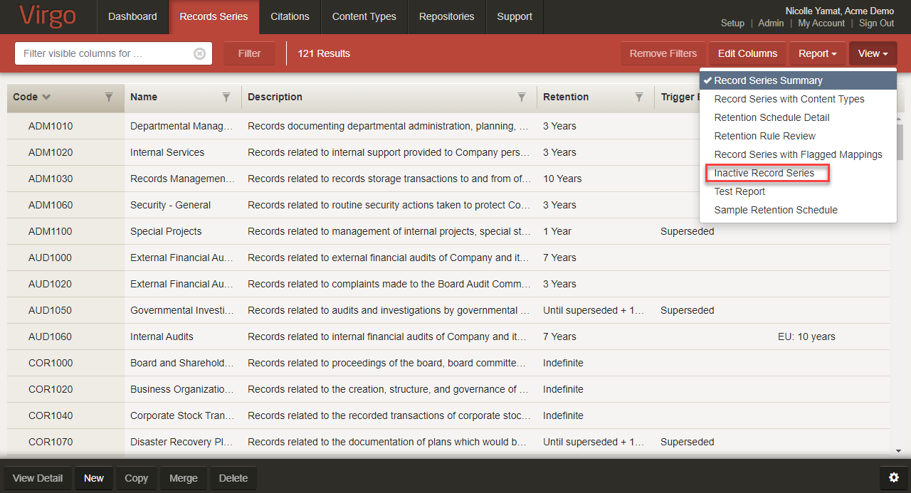 Once you merge, the inactive record series will disappear from the standard views but will not be deleted. To find them, navigate to the View menu and select the Inactive Record Series view. From there, you can change the status of the record series to bring it back into the schedule.