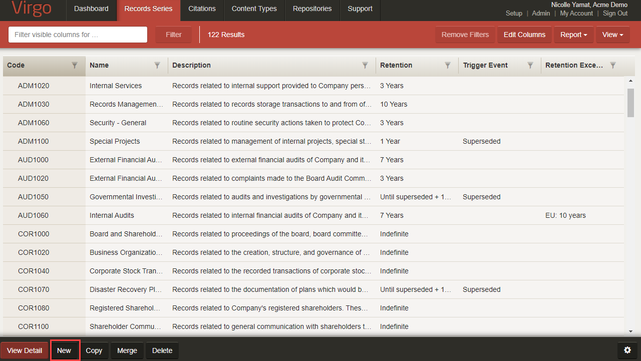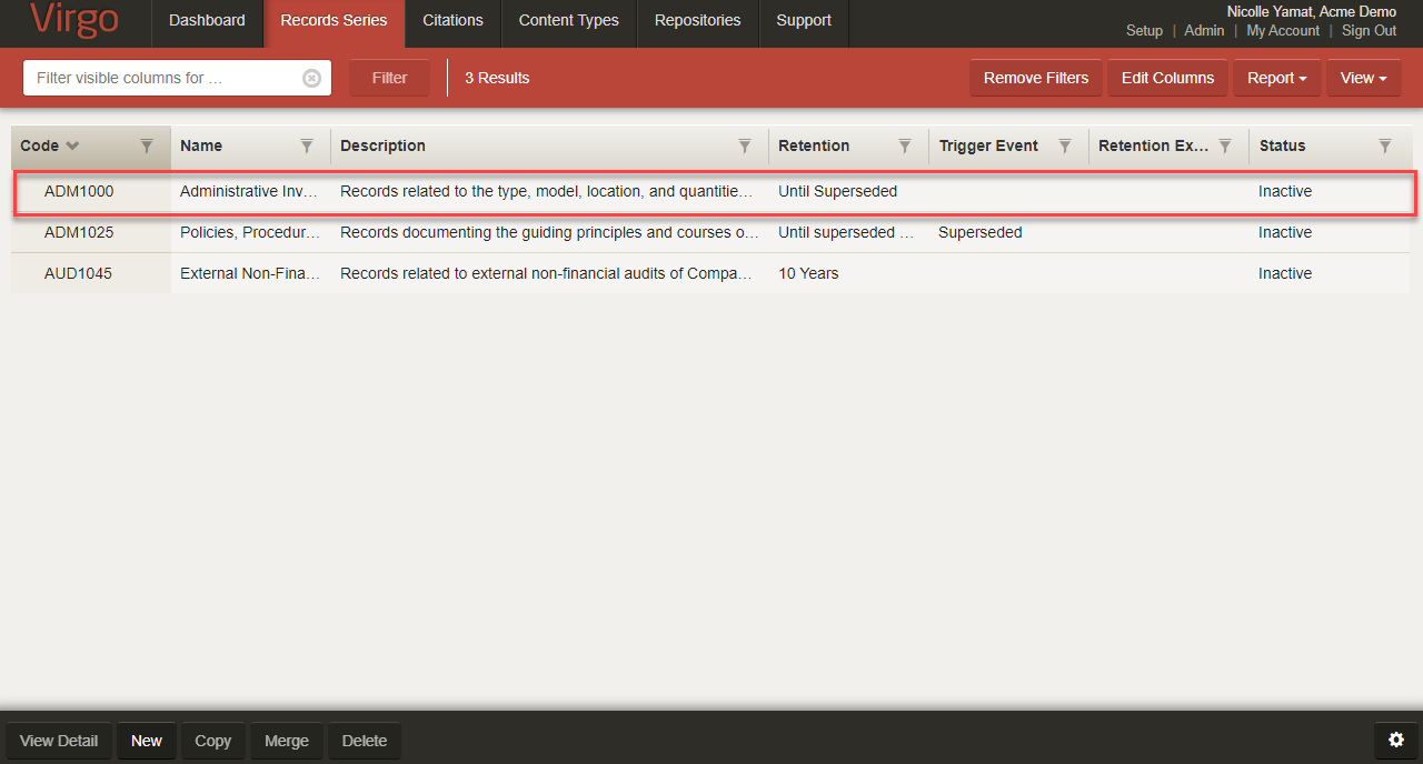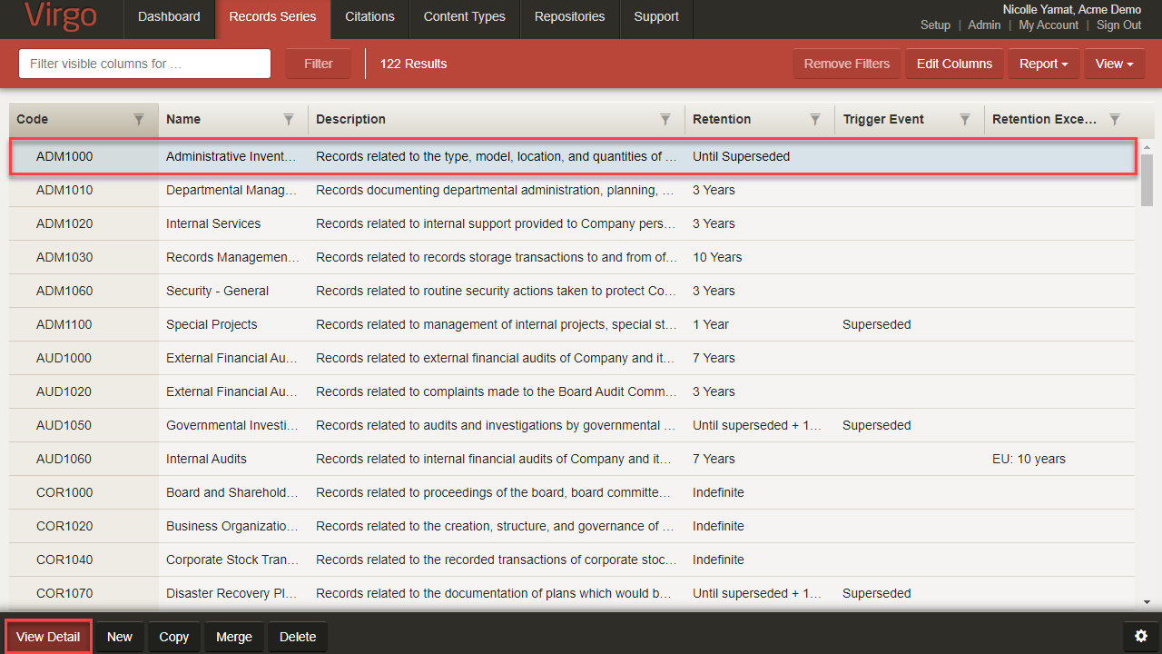 - Double-click on the Record Series you would like to edit or select the Record Series and click View Detail.