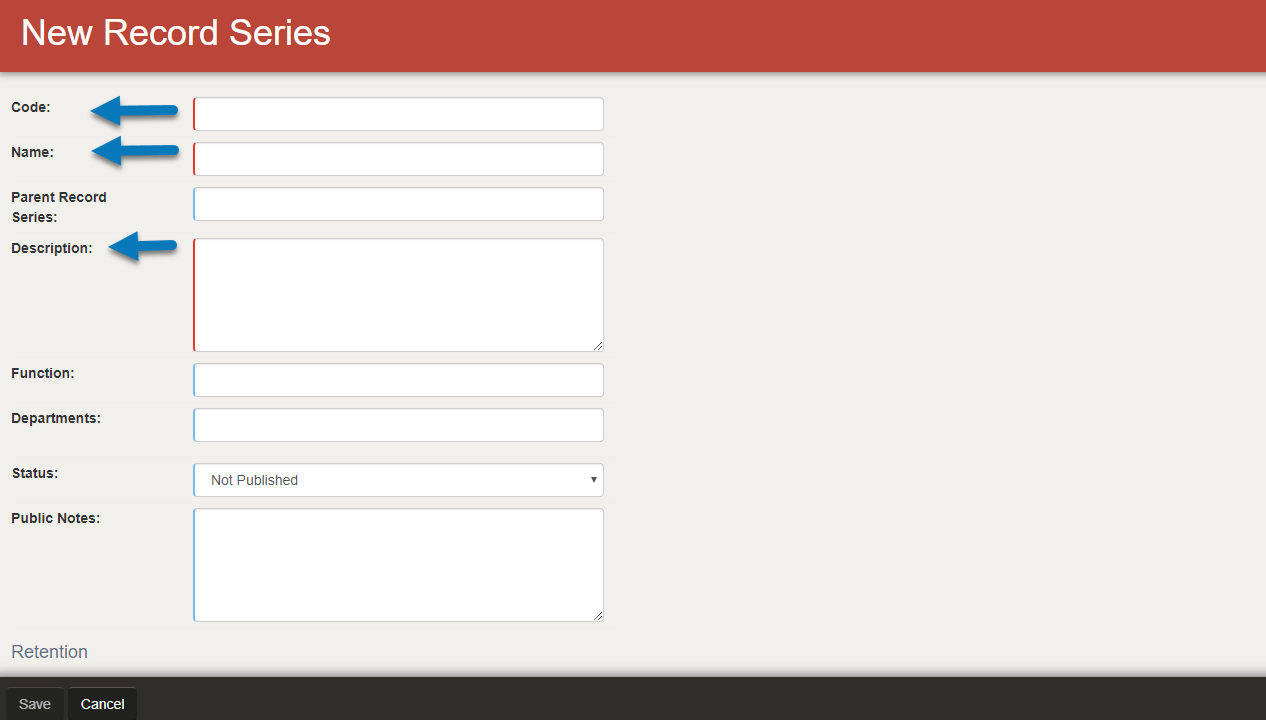 To view an example of the required fields necessary for adding a new record series, hover your mouse over the image.