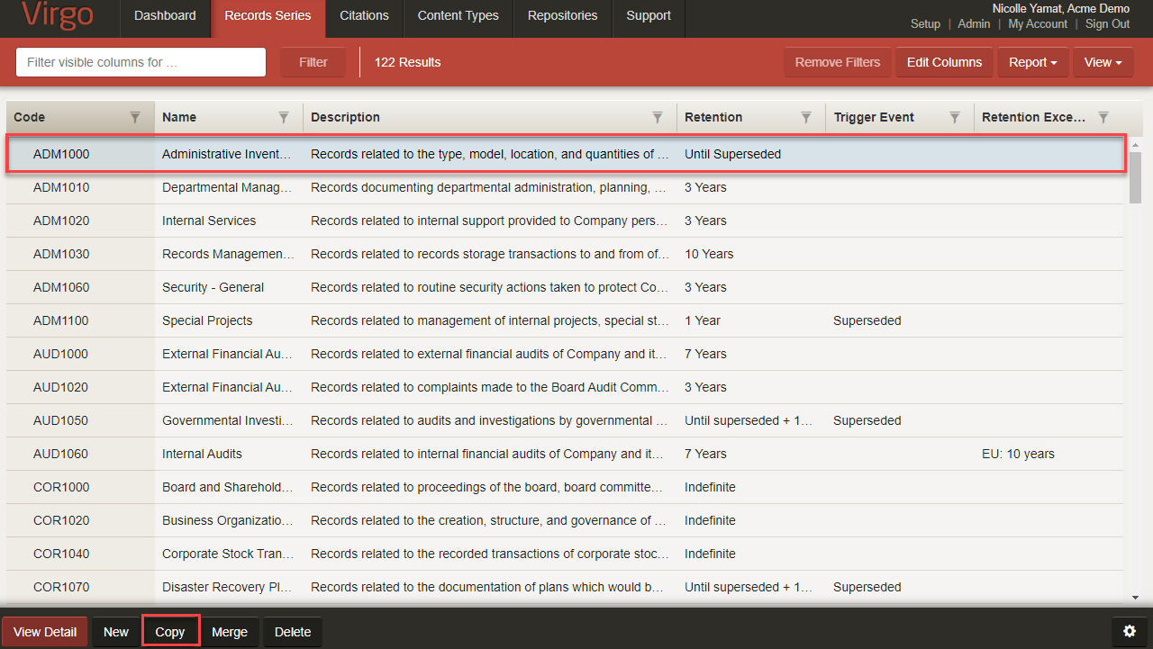 Access Unify | Lifecycle allows you to copy a record series if you are splitting a record series into two or if there is a variation on an existing record series.