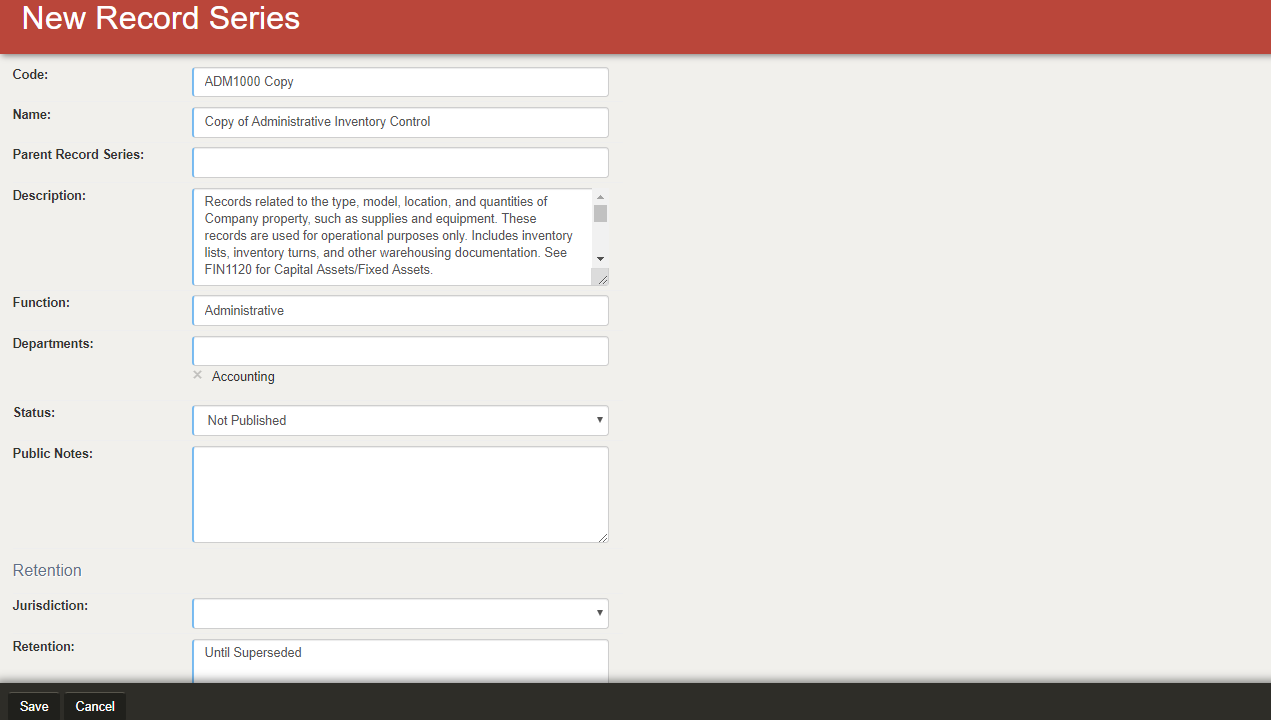 - Access Unify | Lifecycle will prepopulate all the fields from the record series you are trying to copy. You can make any changes by clicking on the appropriate field. For example, click on the Retention field to update the retention information.