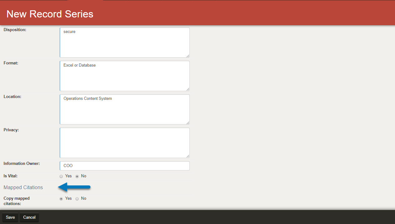 If you scroll to the very bottom, there is an additional field called Mapped Citations. Select Yes to copy citations mapped to the Record Series. Select No to not copy citations mapped to the Record Series.