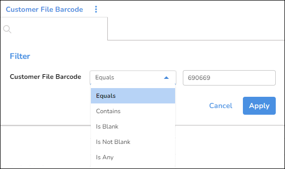 | Equals | Ensures the items in the column match the specified criteria precisely, without any variations or partial matches. For example, in Invoice Number if you enter 12345, the column will only display an invoice with the number 12345. |