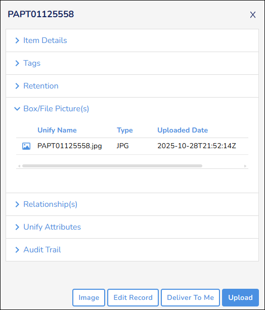 , the Box/File Picture(s) section of the record details panel includes an image of the record’s exterior.